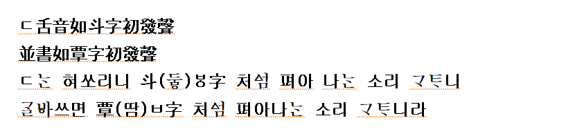 (박창원:2005 역) ‘ㄷ’은 설음(설첨음)이니 ‘두;’ 자의 처음 나는 소리와 같으니,
