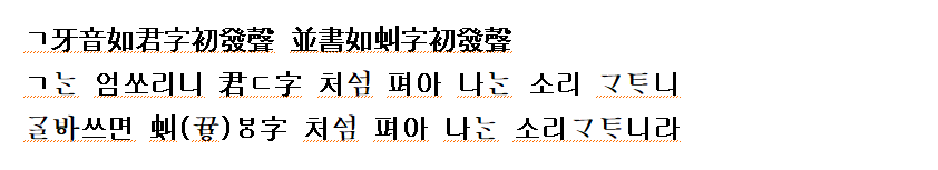 (박창원:2005 역) ‘ㄱ’는 연구개음이니 ‘군;군(현대한자음;동국정운식한자음)’자의 처음 나는 소리와 같으니,