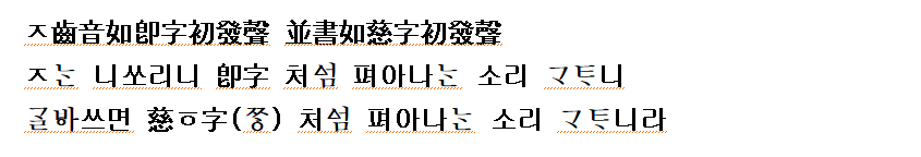 (강신항:1974 역) ㅈ는 잇소리니‘즉’자의 처음 나는 소리와 같으니 나란히 쓰면‘’자의 처음 나는 소리와 같다.