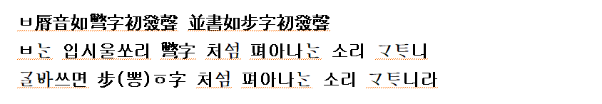 (조규태:2007 역) ‘ㅂ’은 입술소리이니, ‘’자 첫소리와 같다. 나란히 쓰면 ‘뽕’자 첫소리와 같다.