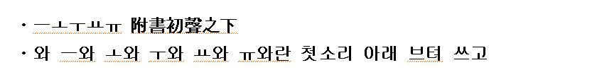 (조규태:2007 역) ‘ㆍㅡㅗㅜㅛㅠ’는 첫소리 아래에 붙여 쓰고,