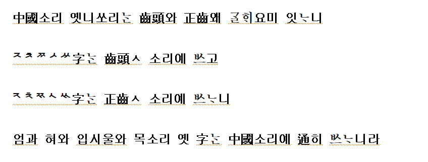 어금니소리와 혓소리와 입술소리와 목구멍소리의 글자는 중국 소리에 두루 쓰나니라