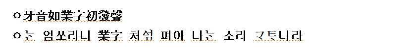 ㆁ 엄쏘리니 業字 처 펴아 나 소리 니라