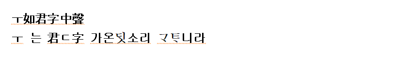 (조규태:2007 역) ‘ㄱ’은 어금닛소리이니, ‘군’자 첫소리와 같다. 나란히 쓰면 ‘’자 첫소리와 같다.