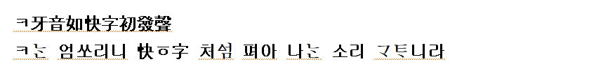 (강신항:1974 역) ㅋ는 엄소리니 ‘쾡’자의 처음 나는 소리와 같다.