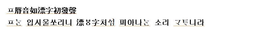 (국립국어원:2008 역) ㅍ는 입술소리(양순음)이니 ‘’자의 처음 나는 소리와 같다.