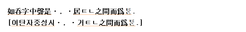 (박지홍:1984 역) (그것은) 呑자의 중성은 ㆍ인데, ㆍ가 ㅌ과 ㄴ의 사이에 놓여서 [탄]을 만듦과,