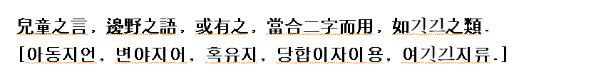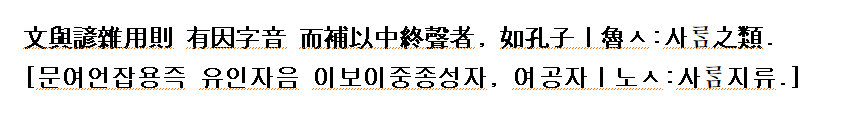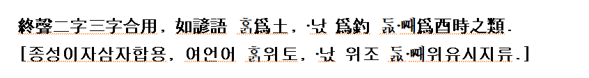 (홍기문:1946 역) 終聲의 두 字나 석 字를 合用함은 諺語에 이 土가 되고