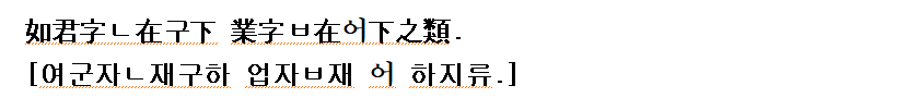 (강신항:1974 역) 예를 들면 군(君)자의 ㄴ은 구의 밑에 있고, (業)자의 ㅂ은 ㅓ의 밑에 있음과 같다.