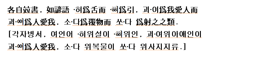 (강신항:1974 역) 각자병서는 가령 우리말의 ·혀는 설(舌)이 되는데 ·는 인(引)의 뜻이 되며,